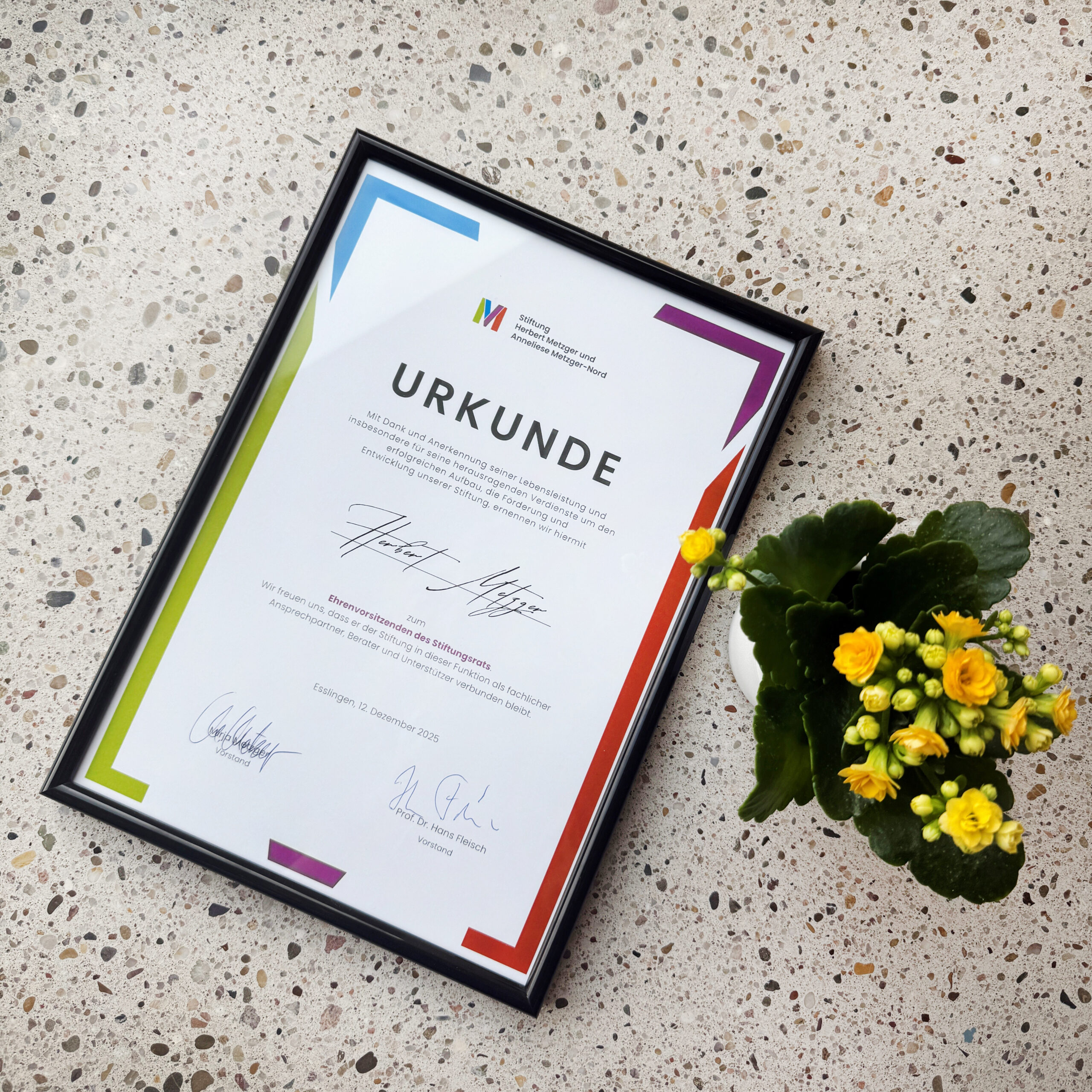 Als Ausdruck tiefen Dankes und in Würdigung seiner herausragenden Lebensleistung hat der Stiftungsvorstand Herbert Metzger zum Ehrenvorsitzenden des Stiftungsrats berufen. In dieser Rolle bleibt er der Stiftung weiterhin eng verbunden und wird ihre Arbeit auch künftig mit Rat, Erfahrung und inspirierender Präsenz begleiten.
